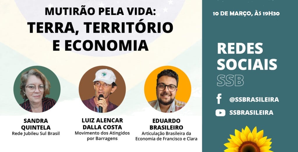 No próximo dia 10 de março, às 19h30, a 6ª Semana Social Brasileira (SSB) promove o primeiro “Ao Vivo 2021”. Vai ser um mutirão de conversa, escuta, articulação, mobilização e formação a partir do tema “Mutirão pela vida: Terra, Território e Economia”. O debate será transmitido nas redes sociais da 6ª SSB no Facebook e no seu canal no Youtube.
