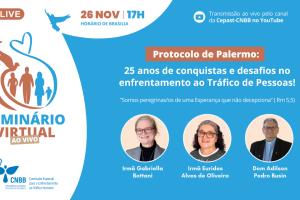 O evento, a ser realizado pela Comissão Episcopal Especial de Enfrentamento ao Tráfico Humano (CEETH-CNBB), tem o tema "Protocolo de Palermo: 25 anos de conquistas e desafios no Enfrentamento ao Tráfico de Pessoas!", acontecerá no dia 26 de novembro, às 17h (horário de Brasília). A transmissão será ao vivo pelo canal da Cepast-CNBB no YouTube