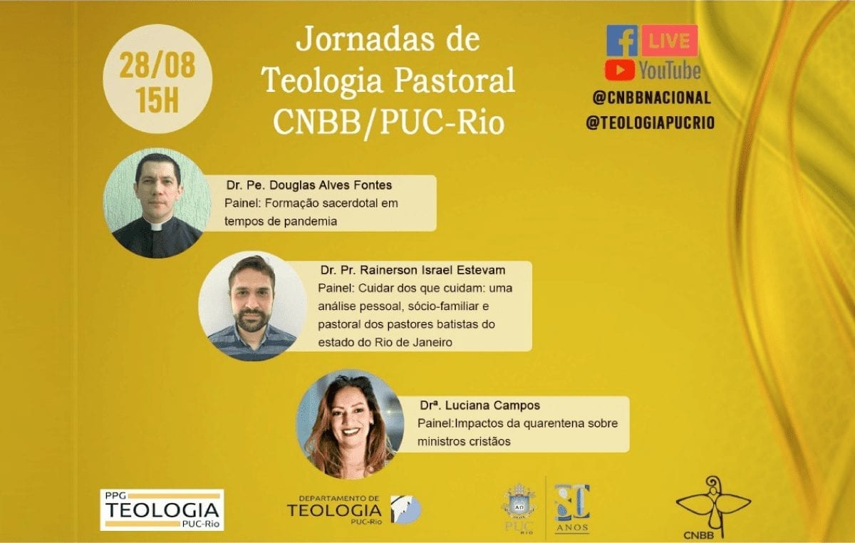 O impacto da Covid-19 na vida e na missão dos ministros cristãos será a temática da terceira livre das Jornadas de Teologia Pastoral promovida pela Conferência Nacional dos Bispos do Brasil (CNBB) e Pontifícia Universidade Católica do Rio (PUC-RIO), que acontecerá na próxima sexta-feira, dia 28 de agosto. Os painelistas serão o doutor e padre Douglas Alves Pontes, que discorrerá sobre “Formação sacerdotal em tempos de pandemia”; doutor e pastor Rainerson Israel Estevam, que terá como tema “Cuidar dos que cuidam: uma análise pessoal, sócio-familiar e pastoral dos pastores batistas do estado do Rio de Janeiro”; e a doutora Luciana Campos, que fará uma síntese das duas primeiras apresentações com o painel: “Impactos da quarentena sobre ministros cristãos”.