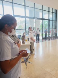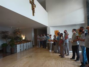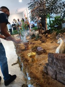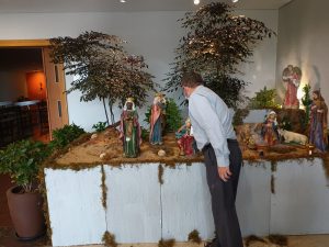 Reunidos no hall de entrada da sede, cada assessor e colaborador teve a oportunidade de levar uma imagem/personagem para o presépio, na medida em que iam dando explicações sobre o conteúdo evangelizador de cada uma delas.