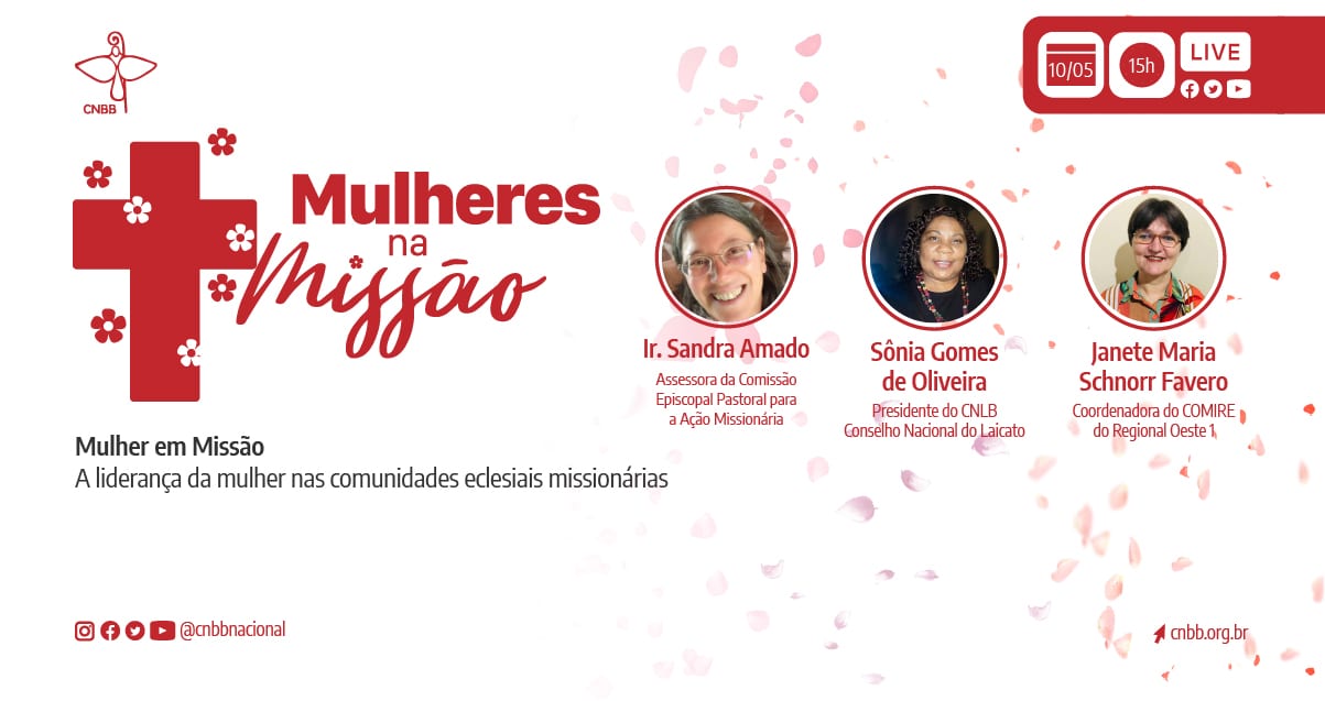 Mediada pela assessora da Comissão para a Ação Missionária da CNBB, irmã Sandra Regina Amado, a live contará com a presença da presidente do Conselho Nacional do Laicato do Brasil, Sônia Gomes de Oliveira e a coordenadora do COMIRE do Regional Oeste 1 da CNBB (Mato Grosso do Sul), Janete Maria Schnorr Favero.
