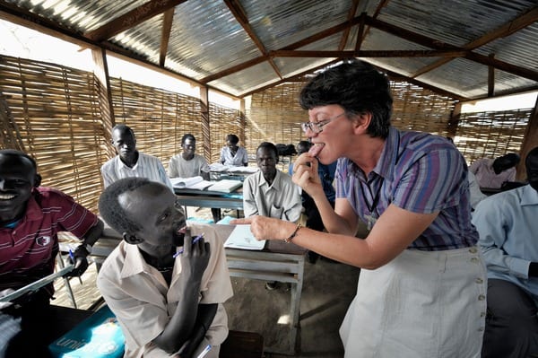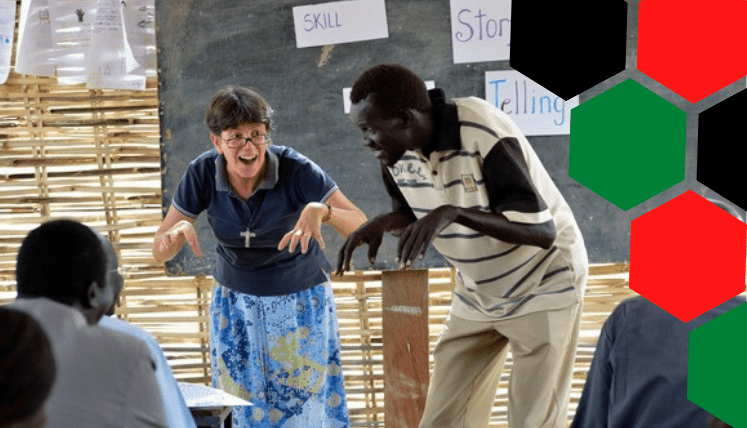 Marcou o encontro com mulheres, numa cultura predominantemente patriarcal, que desejavam ser professoras, mas lhes faltava formação. Nós as ajudávamos! Nesse contexto conheci a Achol e a Achai, jovens mulheres da etnia Dinka. Para Solidarity with South Sudan, a capacitação de mulheres professoras é um objetivo. Assim, Achol e Achai vieram para o treinamento. Elas sabiam árabe e suas línguas locais, mas pouco inglês, a língua franca da educação do país. Em choque por não conseguirem se comunicar com os colegas no STTC (em inglês: Solidarity Teacher Training Center), na primeira semana já queriam desistir, vieram dizer que iam embora, pois não sabiam o suficiente da língua para continuar o programa.