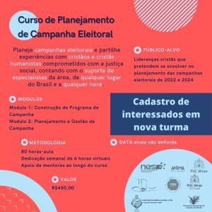 O Centro Nacional de Fé e Política Dom Hélder Câmara (Cefep) em parceria com a Comissão Episcopal Pastoral para o Laicato, a Comissão Brasileira de Justiça e Paz (CBJP), o Conselho Nacional do Laicato do Brasil (CNLB) e com a Escola Casa Comum do Núcleo de Estudos Sociopolíticos da PUC Minas abriram pré-inscrições para uma nova turma do Curso de Planejamento de Campanha Eleitoral.