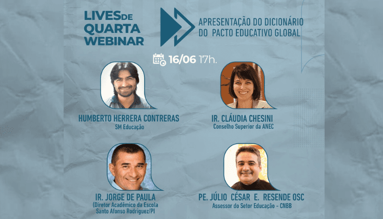 A live desta semana recebe o professor Humberto Herrera Contreras (SM Educação); a Irmã Claudia Chesini (Conselho Superior da ANEC) e o Irmão Jorge de Paula (Dir. Escola Santo Afonso Rodriguez). A mediação será do assessor do Setor Educação da CNBB, padre Júlio César Resende.