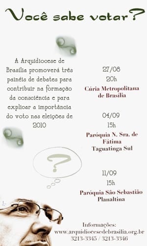 Para ajudar na formação da consciência política nestas eleições, a arquidiocese de Brasília (DF) promoverá três painéis de debates. Eles terão caráter formativo e explicativo e percorrerão as cidades de Taguatinga, Plano Piloto e Planaltina. Cerca de 150 pessoas participarão da programação nos locais.