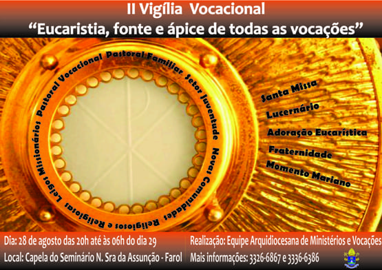 Para encerrar o mês vocacional 2010 (Agosto), a equipe arquidiocesana de Ministérios e Vocações, da arquidiocese de Maceió (AL) irá realizar a 2ª Vigília Vocacional, nos dias 28 e 29 de agosto, com o objetivo de rezar com e por todas as expressões vocacionais presentes na arquidiocese de Maceió. O tema será “Eucaristia, fonte e ápice de todas as vocações”, entendendo, então, o Cristo Eucarístico como princípio e fim de toda vocação.
