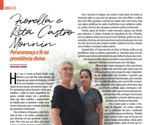“Há 1 ano e 3 meses no Brasil, Fiorella Castro Monnin e sua mãe Rita Castro Monnin, são migrantes que saíram da Venezuela, em virtude da crise instalada em seu país. Chegaram através de uma carona e sem pertence algum, com fé e perseverança, juntas buscaram o Brasil para trabalhar e cuidar da saúde, progredindo aos poucos, contado sempre com a providência divina que abriu caminhos e oportunidades de trabalho para se manterem e ainda enviar recursos financeiros para o restante da família que permanece na Venezuela”.