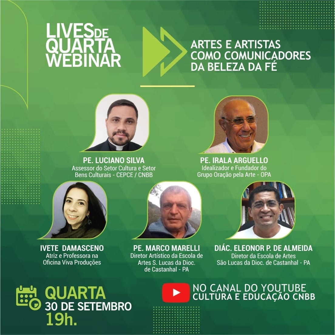 Nesta quarta-feira, 30 de setembro, às 19h, o webinar promovido pela Comissão Episcopal Pastoral para a Cultura e a Educação da Conferência Nacional dos Bispos do Brasil (CNBB) vai refletir o tema “Artes e artistas como comunicadores da beleza da fé”.