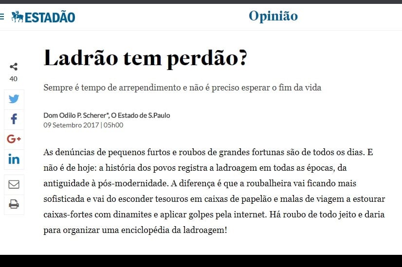 Cardeal Odilo Pedro Scherer, arcebispo metropolitano de São Paulo, assina artigo publicado no jornal “O Estado de São Paulo” no qual trata de tema de grande relevância para a reflexão do momento atual na sociedade brasileira. A começar pelo título, “Ladrão tem perdão?”, a reflexão do cardeal traz elementos de grande significado para o necessário debate público sobre o que está acontecendo no Brasil.