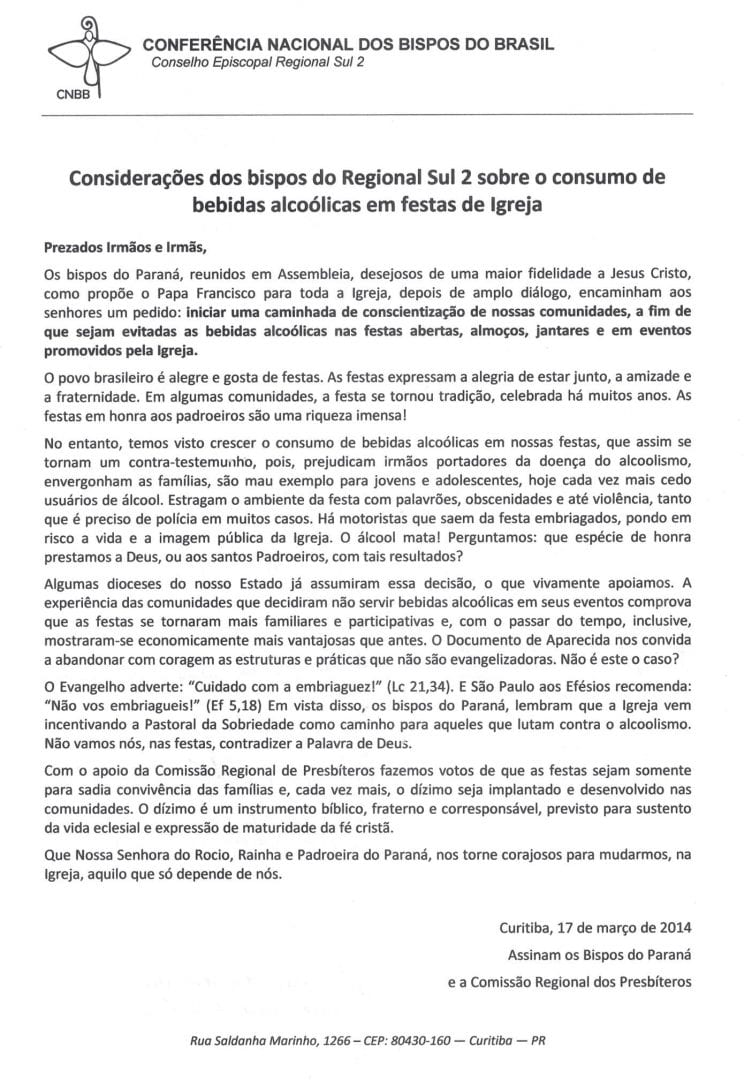 O texto que é endereçado às 18 dioceses, mais a Eparquia Ucraniana São João Batista, que juntas englobam 830 paróquias e mais de 9.700 comunidades católicas no Estado, pede que se “inicie uma caminhada de conscientização das comunidades, a fim de que sejam evitadas as bebidas alcoólicas nas festas abertas, almoços, jantares e em eventos promovidos pela Igreja”.