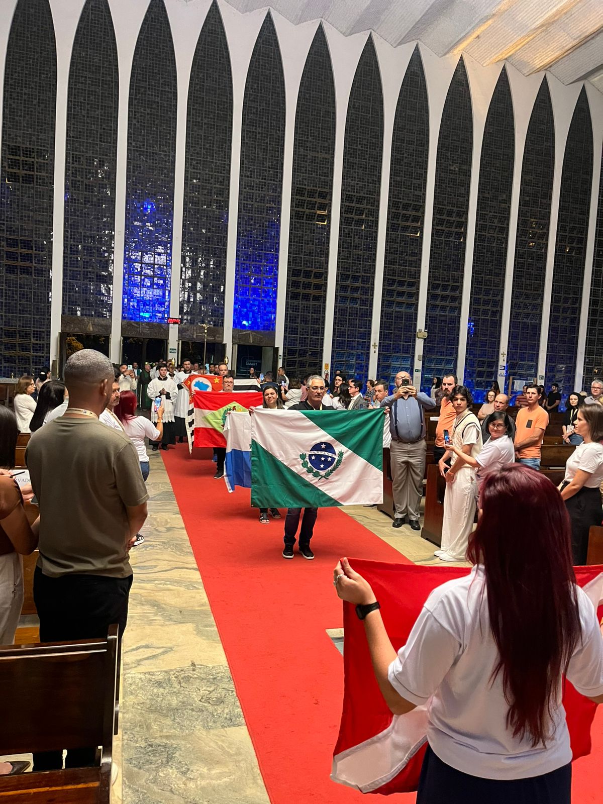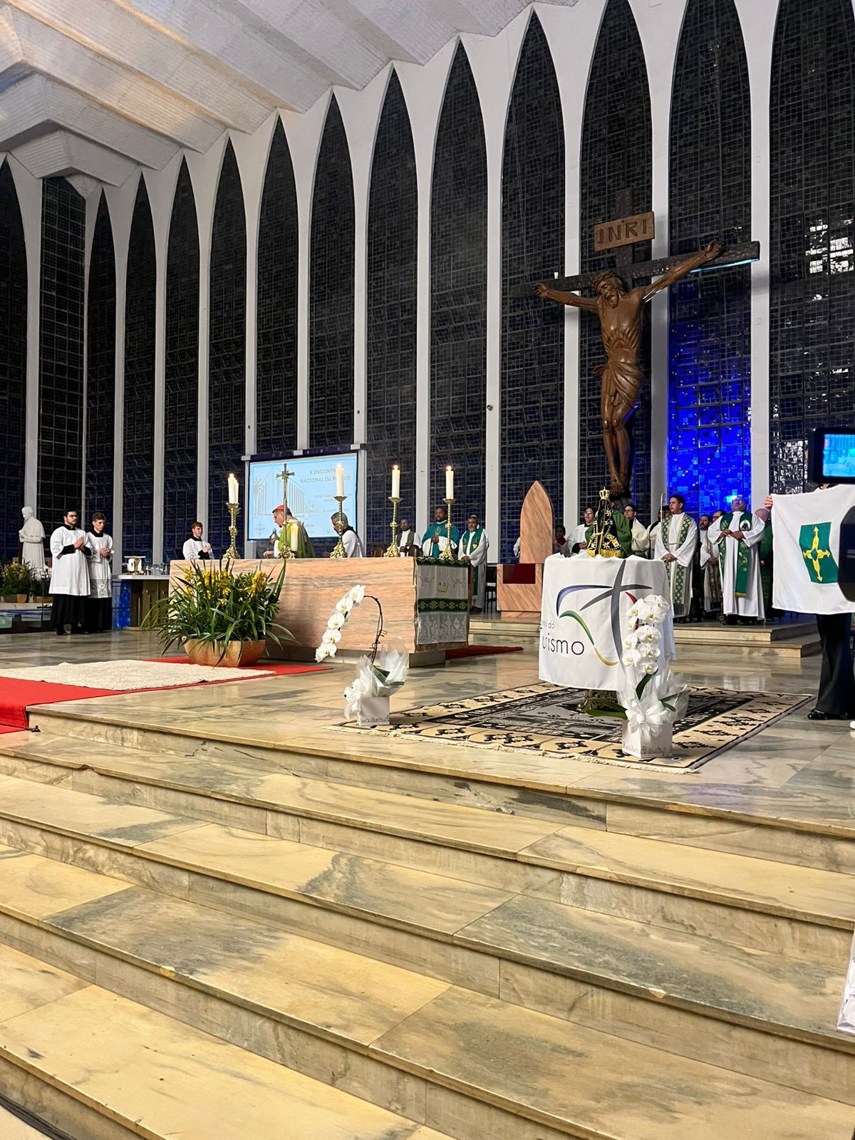 O momento foi seguido por todos, com a oração do Terço, e às 18h30, pela Santa Missa presidida pelo cardeal Paulo Cézar Costa, arcebispo de Brasília, que acolheu os peregrinos e reforçou a importância da missão de cada agente da Pastur no anúncio do Evangelho por meio do turismo com espiritualidade.