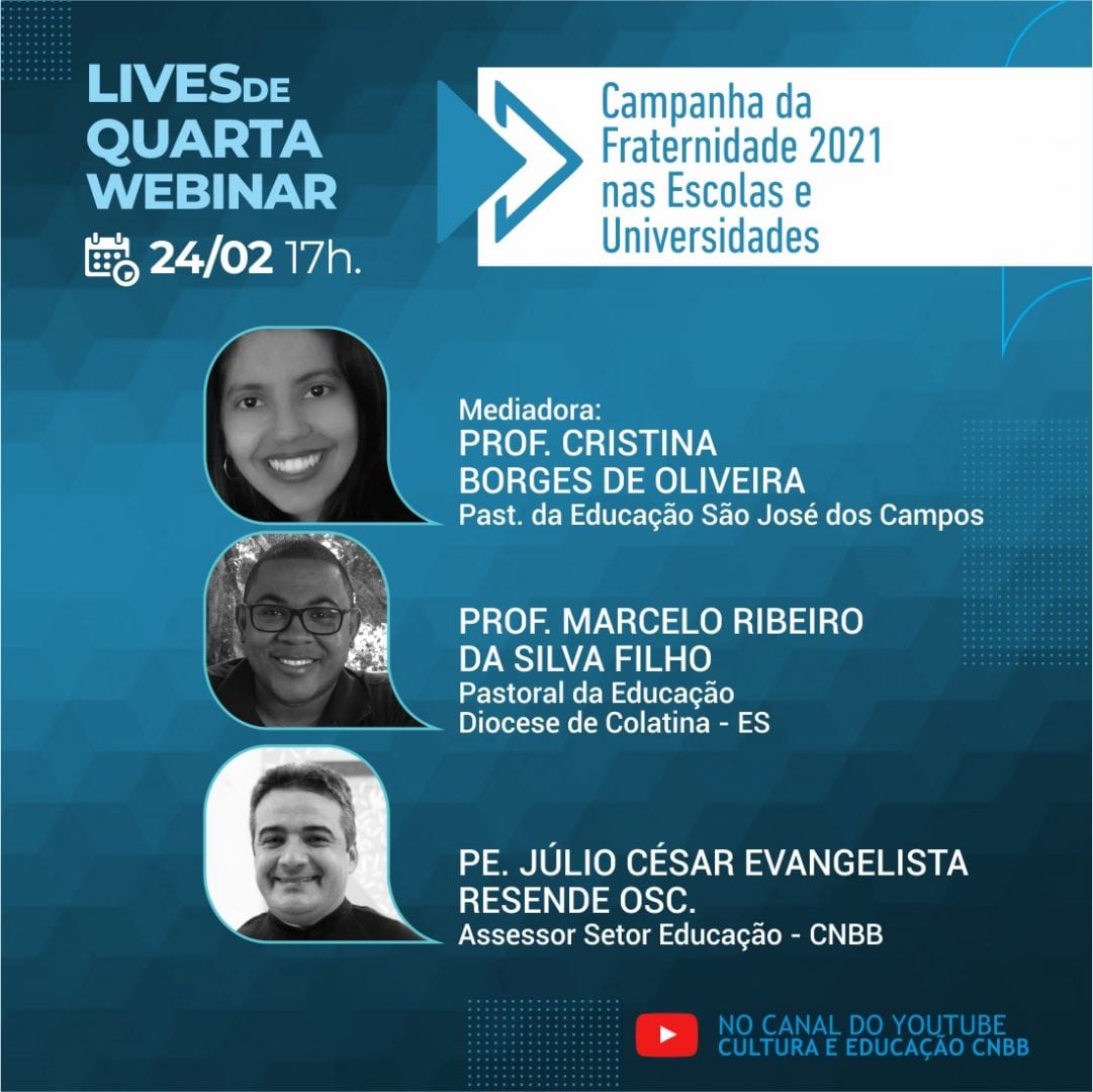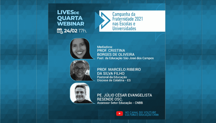O Setor Cultura e Educação da Comissão Episcopal Pastoral para Cultura e Educação da Conferência Nacional dos Bispos do Brasil (CNBB), promove nesta quarta-feira, 24 de fevereiro, o webinar com a temática “Campanha da Fraternidade 2021 nas escolas e universidades”.