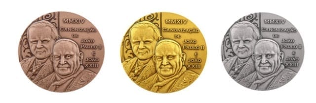Em uma missa, realizada ontem, 4, a Casa da Moeda do Brasil lançou medalhas comemorativas pela canonização dos papas João Paulo II e João XXIII. O lançamento ocorreu no altar Central do Santuário Nacional de Aparecida (SP). Três modelos, confeccionados em ouro, prata e bronze, foram apresentados ao público.