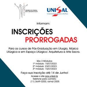 Foram prorrogadas até o dia 14 de junho as inscrições para três cursos de pós-graduação lato senso na área da Liturgia oferecidos pelo Centro de Liturgia dom Clemente Isnard e pelo Centro Universitário Salesiano de São Paulo. As formações ocorrem de forma presencial e têm apoio da Comissão Episcopal Pastoral para a Liturgia da Conferência Nacional dos Bispos do Brasil (CNBB).