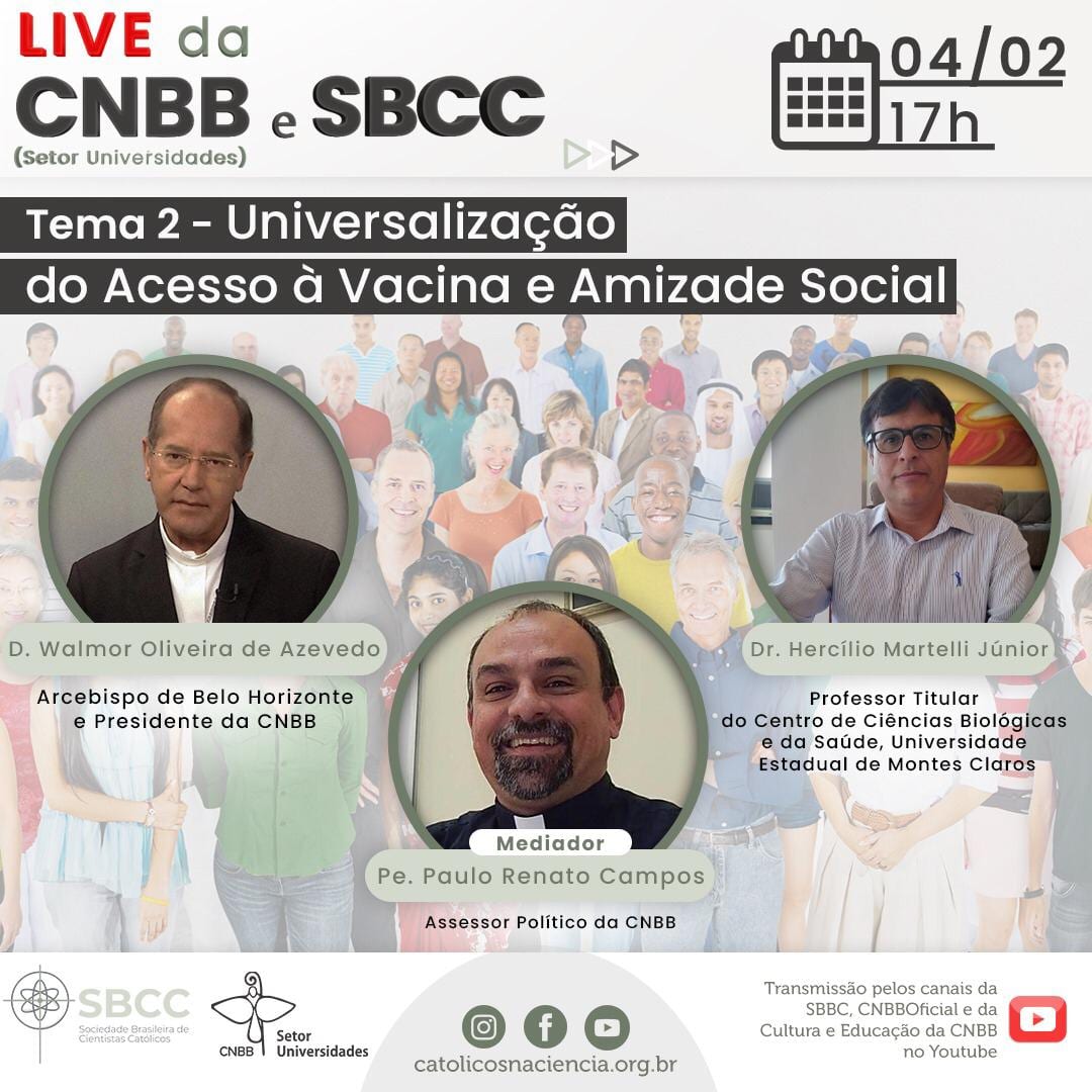 O webinar tem como tema: “Ciência e Fé Católica: Universalização do Acesso à Vacina e Amizade Social”. A transmissão poderá ser acompanhada a partir das 17h pelos canais da CNBB, SBCC e da Comissão para Cultura e Educação no Youtube.