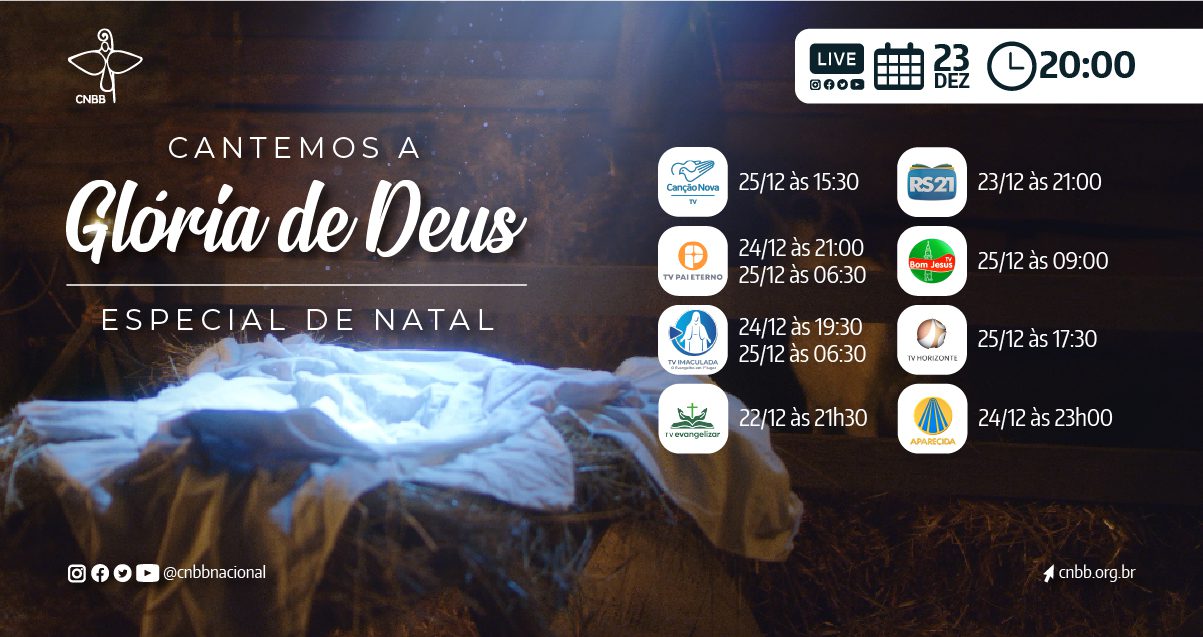 Pela primeira vez a Conferência Nacional dos Bispos do Brasil (CNBB) oferece à Igreja no Brasil o Especial de Natal “Cantemos a Glória de Deus” que será exibido, em diferentes horários, nos canais de TV de inspiração católica, entre os dias 23 a 25 de dezembro, e nas redes sociais da entidade.