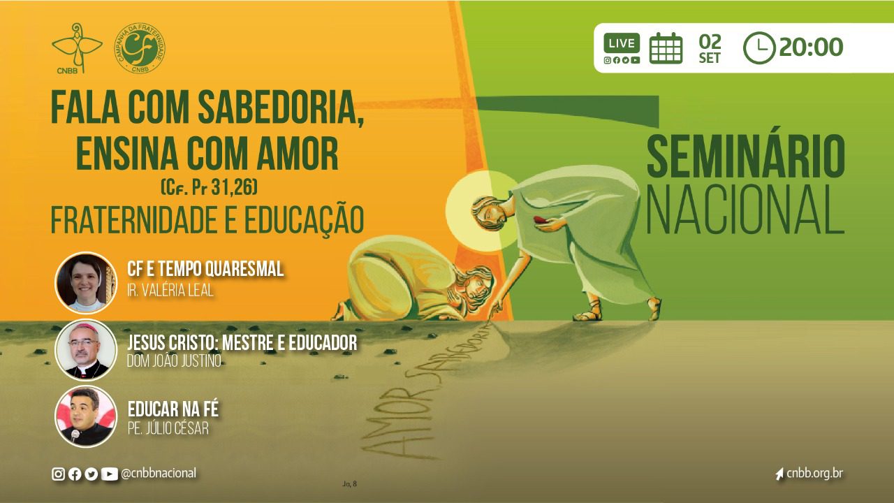 Pela segunda vez em modalidade virtual, o Setor de Campanhas da Conferência Nacional dos Bispos do Brasil (CNBB) promove, nesta semana, o Seminário Nacional da Campanha da Fraternidade (CF). Nesta quinta-feira, a partir das 20h, acompanhe pelas redes sociais o segundo dia da formação voltada para a CF do próximo ano, cujo tema é “Fraternidade e Educação” e o lema “Fala com sabedoria, ensina com amor”, (Pr 31,26).