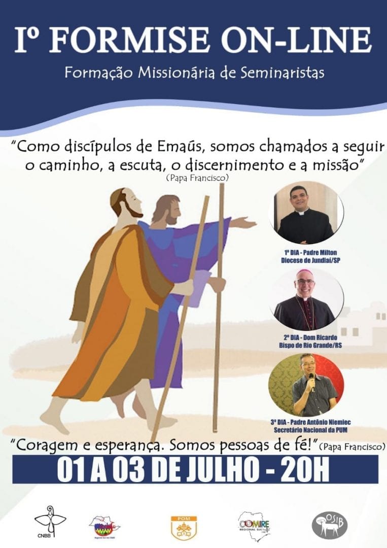 O Conselho Missionário de Seminaristas (COMISE), do regional Sul 1 da CNBB, promove entre os dias 01 a 03 de julho a partir das 20h, o 1° FORMISE (Formação Missionária de Seminaristas), on-line, o qual terá como tema: Como os discípulos de Emaús, somos chamados a seguir o caminho, a escuta, o discernimento e a missão” e o lema: “Coragem e esperança. Somos pessoas de fé!”.