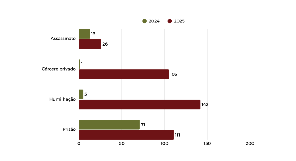 Embora os registros gerais de violência tenham caído de 1.548 para 978 ocorrências, a publicação aponta aumento em formas específicas de repressão: os casos de prisão subiram de 71 para 111; os registros de humilhação saltaram de 5 para 142; e os casos de cárcere privado cresceram de 1 para 105.