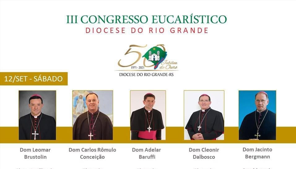 A diocese de Rio Grande (RS) completa 50 anos em 2021. Para abrir o ano jubilar, será promovido um Congresso Eucarístico, a primeira de uma série de atividades entre 12 de setembro de 2020 e 12 de setembro de 2021. O evento iniciará às 13h30min do sábado (12/09) e será todo transmitido pelo canal do Youtube da diocese do Rio Grande. Em meio aos períodos de conferência haverão animações, oração do Santo Terço e interação com a comunidade que acompanha a transmissão.