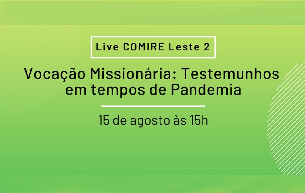 Pensando em fomentar a partilha vocacional e missionária neste período de distanciamento social, o Conselho Missionário Regional (COMIRE) Leste 2 vai realizar uma transmissão ao vivo no dia 15 de agosto, sábado, às 15h no Facebook do Regional.