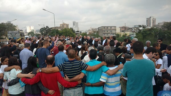 de pessoas seguiram em direção à ponte Dom Waldyr Calheiros, onde realizaram um abraço simbólico ao rio Paraíba do Sul. O pastor Donizete Cavalheiro, representante do Conselho de Pastores de Volta Redonda, elogiou a iniciativa e convidou para a reflexão. “Deus nos deu o poder, o direito de cuidar da sua criação. Nós, como povo de Deus, independente da religião, precisamos cuidar do que Deus fez para nós”, disse.
