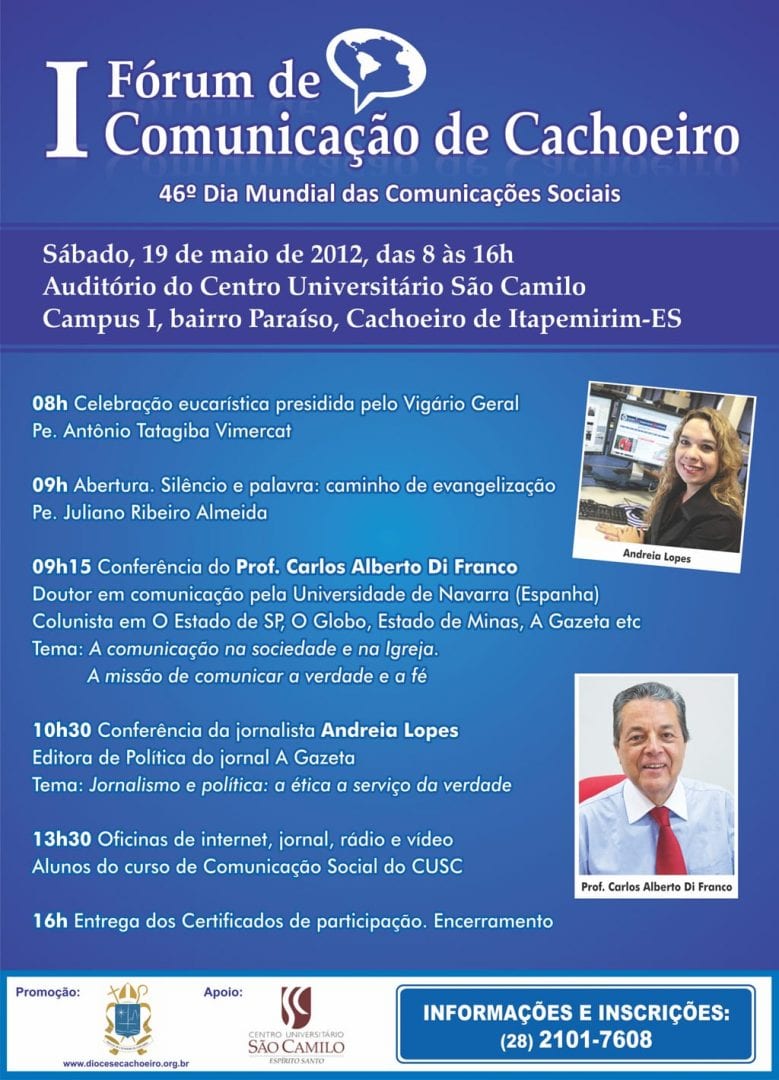 A cada ano, por ocasião da solenidade da Ascensão do Senhor, comemora-se o Dia Mundial das Comunicações. Em 2012, essa ocasião será o domingo 20 de maio. Para comemorar a data, a Equipe Diocesana da Pastoral da Comunicação (PASCOM), juntamente com o Departamento Diocesano de Comunicação da diocese de Cachoeiro de Itapemirim (ES), planejou para o dia 19 de maio, sábado, véspera do Dia Mundial das Comunicações, o 1º Fórum de Comunicação de Cachoeiro.