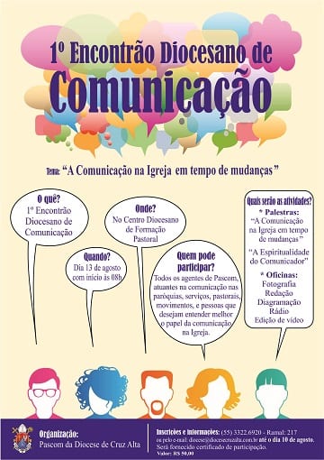 Com o objetivo de reunir comunicadores, profissionais, agentes de pastoral, movimentos e autoridades da Igreja para refletirem a respeito da comunicação e seu uso no trabalho, na vida da Igreja e na sociedade, a Pastoral da Comunicação da diocese de Cruz Alta (RS) realizará a primeira edição do Encontrão Diocesano de Comunicação (EDICOM), no dia 13 de agosto, no Centro de Formação Pastoral.