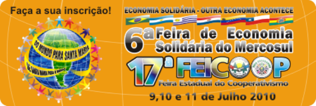 Parte integrante do Programa Nacional de Feiras, a 6ª Feira de Economia Solidária do Mercosul e a 17ª Feira Estadual do Cooperativismo começou ontem, 9, em Santa Maria (RS), e segue até domingo, 11. Os dois eventos são organizados pelo Projeto Esperança/Cooesperança da Diocese de Santa Maria, pelo Fórum Brasileiro de Economia Solidária (FBES), Secretaria Nacional de Economia Solidária (SENAES), Cáritas Brasileira, Instituto Marista Solidariedade, Fórum Gaúcho de Economia Solidária, Prefeitura Municipal de Santa Maria e outras organizações do Brasil, Mercosul e da América Latina.