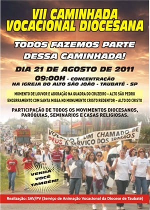 No próximo dia 21, a diocese de Taubaté (SP) promove a 7ª Caminhada Vocacional. O evento iniciará às 9h, na Igreja São João Batista, e em seguida a caminhada segue até o momento de adoração e bênção do Santíssimo Sacramento. A caminhada vai também até o monumento do Cristo Redentor, ponto turístico na cidade, onde acontecerá a missa de encerramento da caminhada, presidida pelo bispo de Taubaté, dom Carmo João Rhoden.