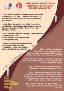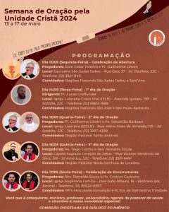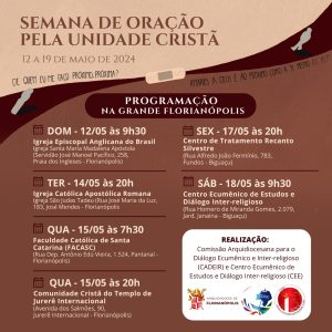 Motivados pelo tema “Amarás o Senhor teu Deus… e ao teu próximo como a ti mesmo” (Lc 10, 27)” escolhido para a Semana de Oração pela Unidade dos Cristã (SOUC) 2024, muitos grupos da Igreja no Brasil realizam de 12, Ascensão do Senhor, a 19 de maio, Solenidade de Pentecostes, ações para motivar a unidade e o ecumenismo entre Igrejas.