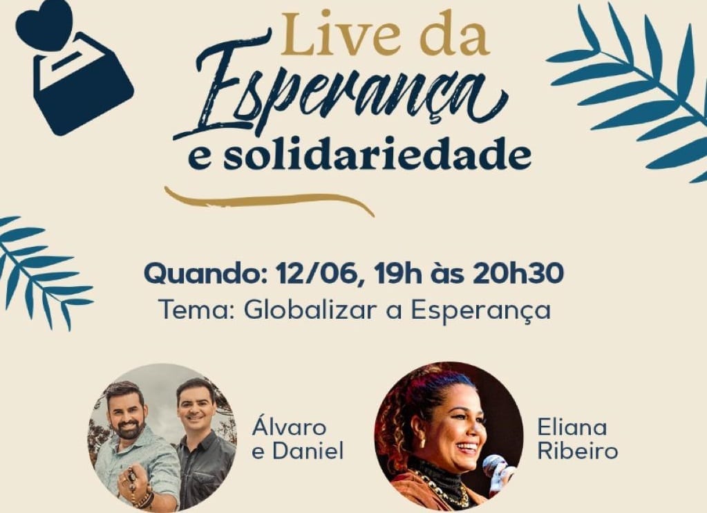 O “sextou” deste 12 de junho tem um clima especial. A cantora e missionária Eliana Ribeiro e a dupla sertaneja Álvaro e Daniel animam hoje, às 19h, a “Live da Esperança e da Solidariedade – ficar em casa e fazer a diferença!” que tem como tema: globalizar a esperança. As transmissões são sempre pelos canais no Youtube da ANEC (@anecbrasil) e da CNBB (@cnbboficial).