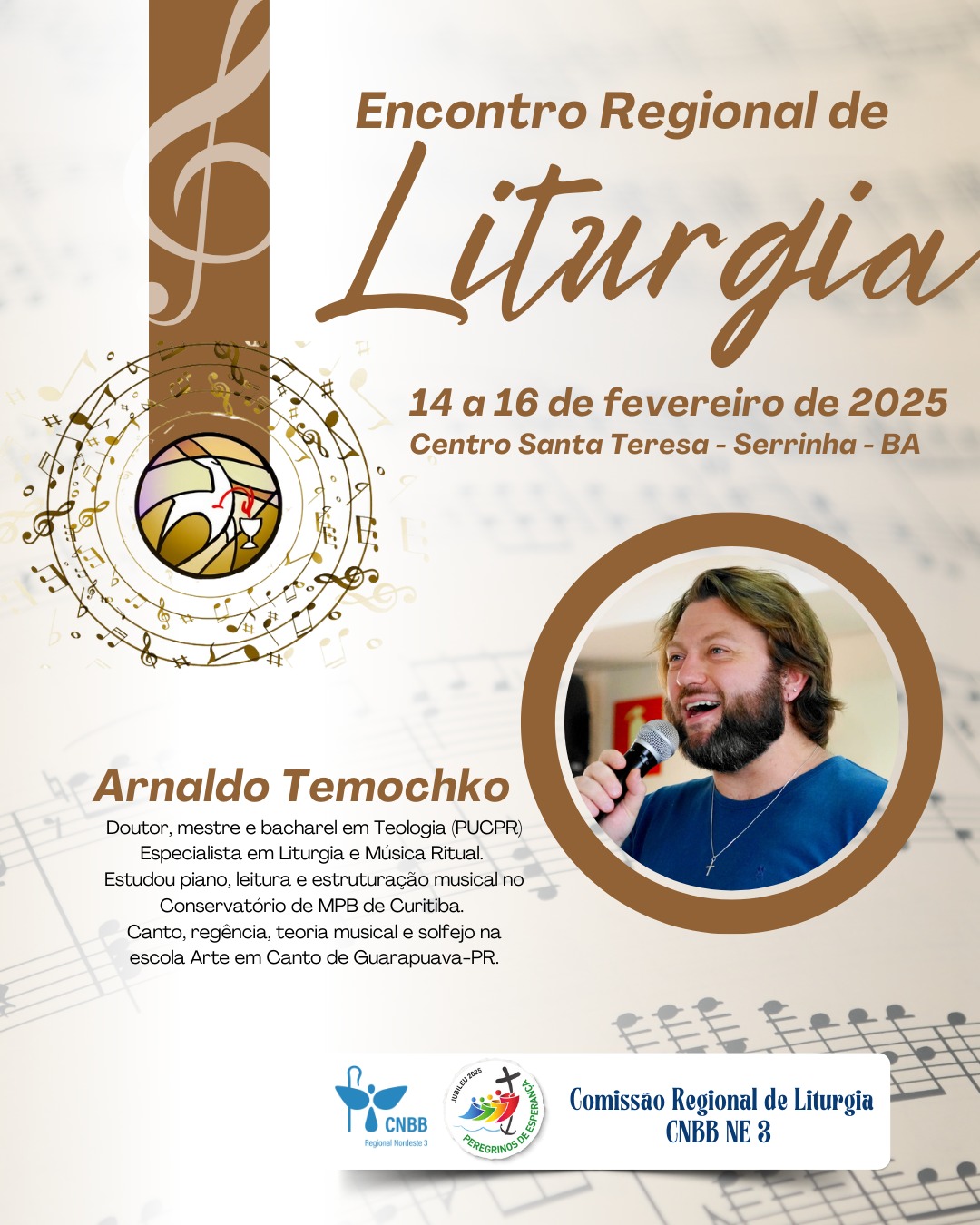 De 14 a 16 de fevereiro, a Comissão de Liturgia do regional Nordeste 3 promoverá o Encontro Regional de Liturgia, no Centro de Formação Santa Teresa, da diocese de Serrinha, na Bahia. A iniciativa será orientada pelo doutor, mestre e bacharel em Teologia (PUCPR), Arnaldo Temochko, que também é especialista em Liturgia e Música Ritual.