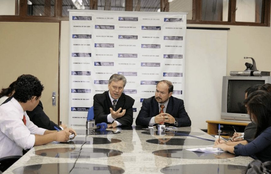 O pró-reitor da Universidade Católica de Brasília (UCB) Luiz Síveres, e o secretário executivo da Comissão Brasileira Justiça e Paz (CBJP), Daniel Seidel, divulgaram na manhã desta quarta-feira, 22, a dinâmica do debate dos presidenciáveis que acontecerá na noite de amanhã, 23, na UCB.