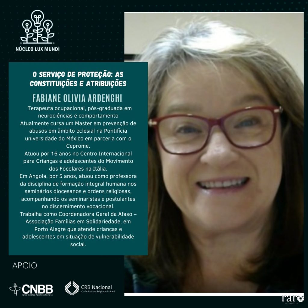 É nesse contexto sobre a educação, que a Terapeuta Ocupacional, especialista em neurociências e comportamento e pós-graduanda em prevenção de abusos em âmbito eclesial na Pontifícia Universidade do México, Fabiane Olívia Ardenghi, vai conduzir sua formação no curso on-line “O Serviço de proteção: as constituições e atribuições”, ofercido pelo Núcleo Lux Mundi.