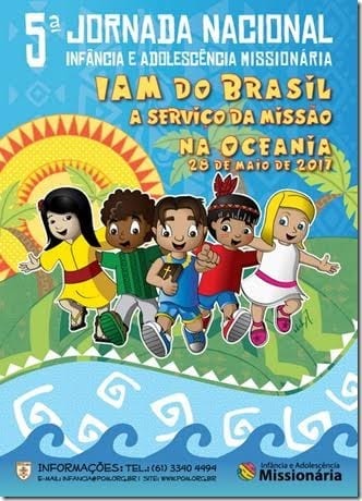 A Pontifícia Obra da Infância e Adolescência Missionária (IAM) divulgou o cartaz oficial de sua 5ª Jornada Nacional. A iniciativa acontece todos os anos no último domingo de maio, nas dioceses do Brasil, para marcar o aniversário de fundação da Obra, criada na França por dom Carlos de Forbin-Janson em 19 de maio de 1843. Em 2017, a 5ª Jornada Nacional da IAM será celebrada no dia 28 de maio com o tema “IAM do Brasil a serviço da missão na Oceania”.
