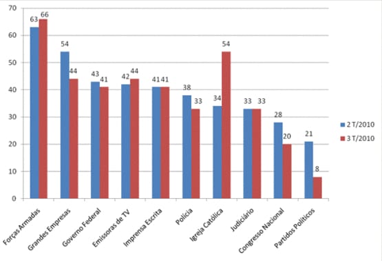 Outras instituições tiveram o seguinte resultado: Grandes Empresas (44%); Emissoras de TV (44%); Governo Federal (41%); Imprensa escrita (41%), Polícia (33%); Congresso Nacional (20%) e os partidos políticos (8%).