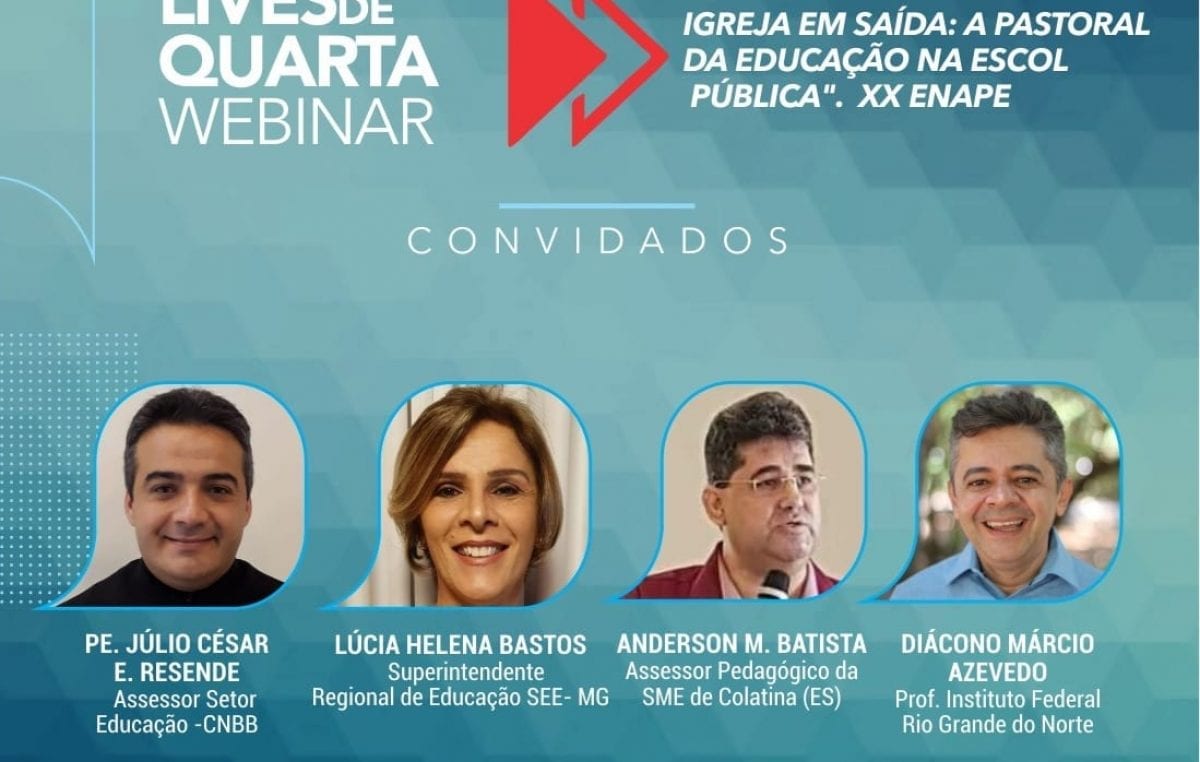 O evento terá como convidados o professor Anderson Batista, assessor pedagógico da Secretária Municipal de Educação de Colatina (ES), o professor e diácono Márcio Azevedo, do Instituto Federal do Rio Grande do Norte, a professora Lúcia Helena Bastos, superintendente Regional de Educação SEE. O mediador será o padre Júlio Resende, assessor do Setor de Educação da CNBB. O webinar também se constitui um evento preparatório do XX Encontro Nacional da Pastoral da Educação (ENAPE).