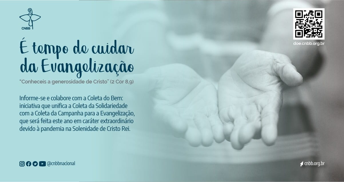 Neste 3 de novembro, a Conferência Nacional dos Bispos do Brasil (CNBB) lança a campanha: É Tempo de Cuidar da Evangelização 2020, uma campanha da Igreja no Brasil. O período de realização será em todo o mês de novembro, tendo na solenidade de Cristo Rei, dia 22, seu momento forte com a realização do grande gesto concreto: a Coleta do Bem. O lema da campanha é: “Somos Igreja: cuidamos da vida, cuidamos do anúncio da Palavra e cuidamos dos pobres”. A campanha é motivada pelo versículo bíblico: “Conheceis a generosidade de Cristo.” (2 Cor 8,9).