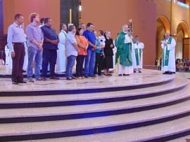 O bispo diocesano, dom Milton Kenan Júnior, presidiu a missa na Basílica de Nossa Senhora Aparecida, ao lado de padres da diocese e de ouras regiões do país. Ao final, recebeu a imagem.