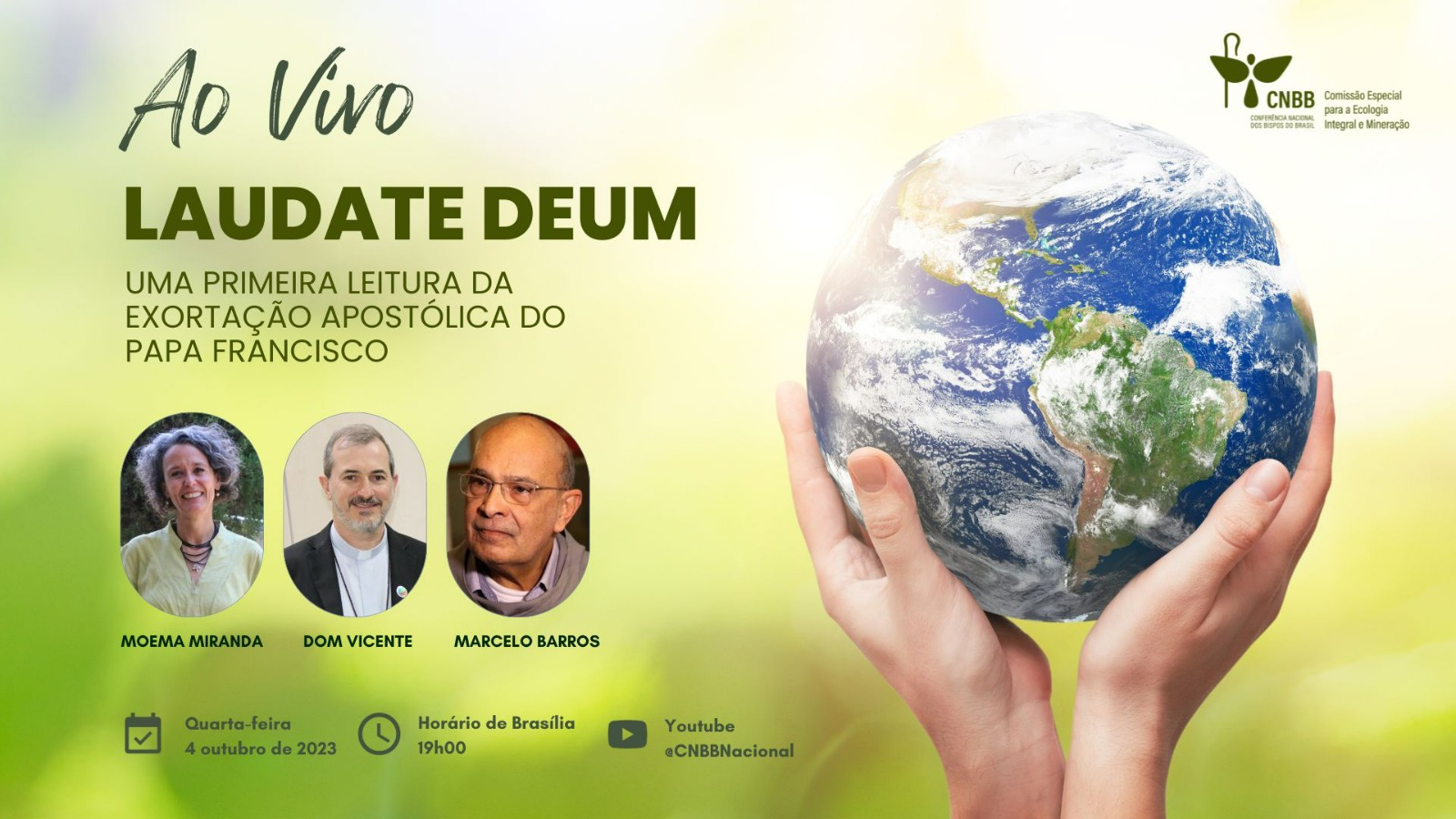 Na Igreja no Brasil, a Comissão Especial para a Ecologia Integral e Mineração (CEEM) da Conferência Nacional dos Bispos do Brasil (CNBB) promove a live “Ao vivo: Laudate Deum – uma primeira leitura da exortação apostólica do Papa Francisco”, às 19h, com transmissão ao vivo pelo canal de youtube da CNBB.
