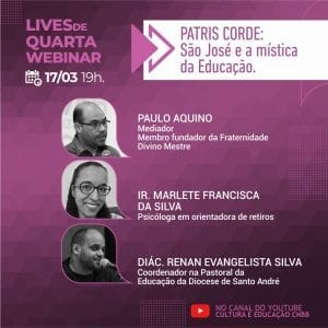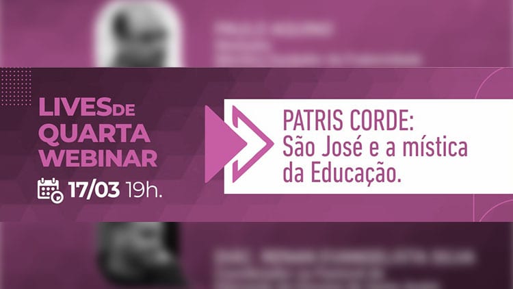 A “Live de Quarta Webinar” promovida pela Comissão Episcopal Pastoral para a Cultura e a Educação da Conferência Nacional dos Bispos do Brasil (CNBB) aborda hoje o tema “Patris Corde: São José e a mística da Educação”. A live está sintonia com o Ano de São José, convocado pelo Papa Francisco, e terá início às 19h com transmissão pelos canais da CNBB e da Comissão para a Cultura e Educação, no Youtube.