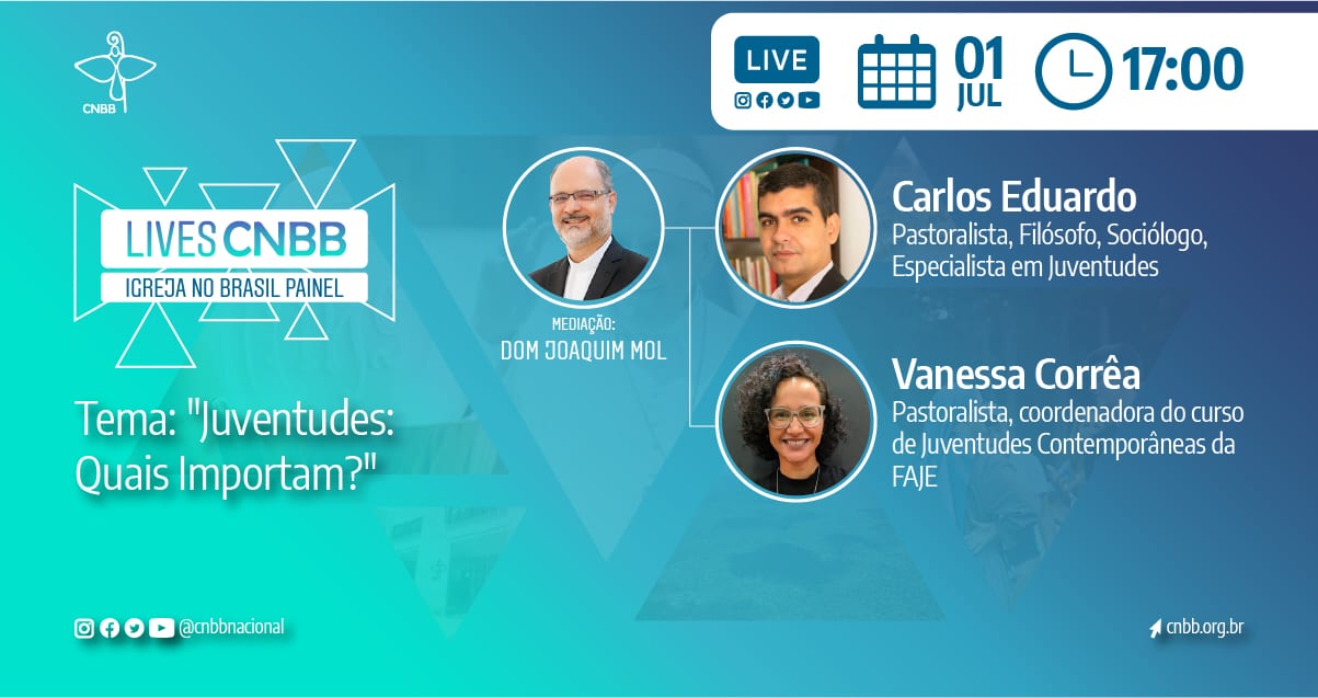 A live Igreja no Brasil Painel está marcada para esta quinta-feira, 1º de julho, às 17h. O bispo auxiliar de Belo Horizonte (MG) e  presidente da Comissão Episcopal Pastoral para a Comunicação da Conferência Nacional dos Bispos do Brasil (CNBB), dom Joaquim Giovani Mol Guimarães, conduz mais um momento de aprofundamento sobre temáticas importantes para a Igreja no Brasil. O tema desta edição será “quais juventudes importam?”. A transmissão ao vivo será feita pelas redes sociais da CNBB.