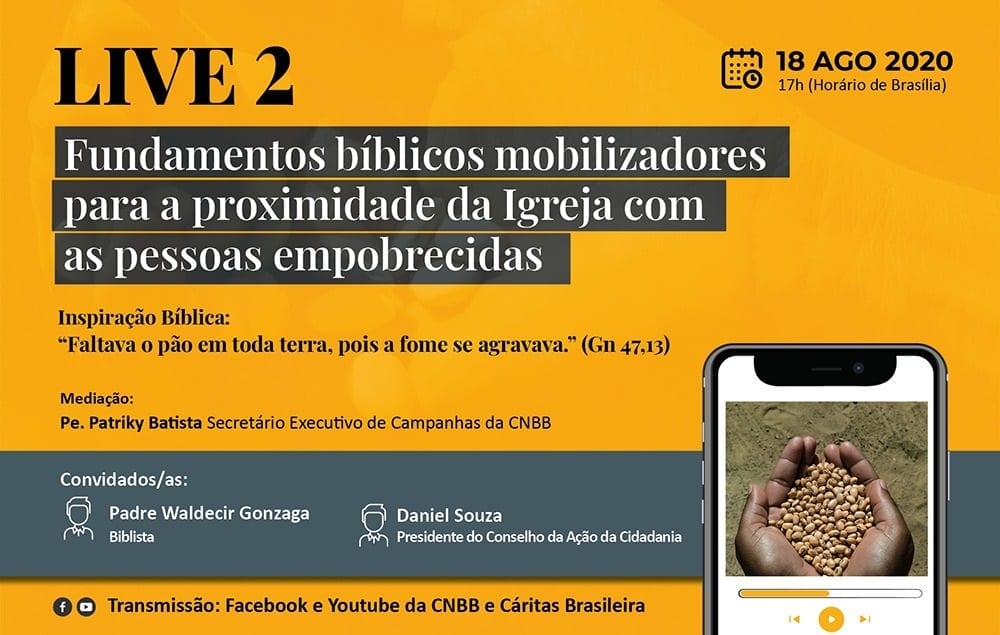 A segunda live da série sobre a “Fome” está marcada para amanhã, 18 de agosto, às 17hh, e vai abordar o tema: “Fundamentos bíblicos mobilizadores para a proximidade da Igreja com as pessoas empobrecidas”, o que corresponde ao momento do “julgar”. A live tem como inspiração bíblica: “Faltava o pão em toda terra, pois a fome se agravava.” (Gn 47,13).