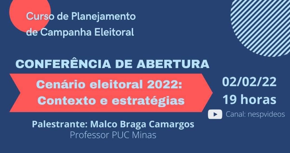 Nesta quarta-feira, 2 de fevereiro, às 19h, o curso de Planejamento de Campanha Eleitoral realiza a conferência inaugural “Eleições 2022: contexto e estratégias”. O professor Malco Camargos será o conferencista e abordará o tema Brasil que vai às urnas: “o contexto da disputa presidencial, a polarização e o pequeno espaço da terceira via”.