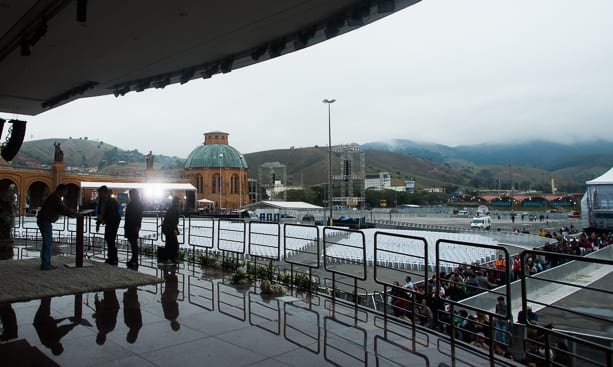 Milhares de pessoas enfrentaram a madrugada com sensação térmica de 4 graus para participar da missa que será presidida pelo Papa Francisco em Aparecida, logo mais às 10h30, no Santuário Nacional. Por volta das 7 da manhã, enquanto os fiéis começavam a passar pela revista da segurança, começou a chover.