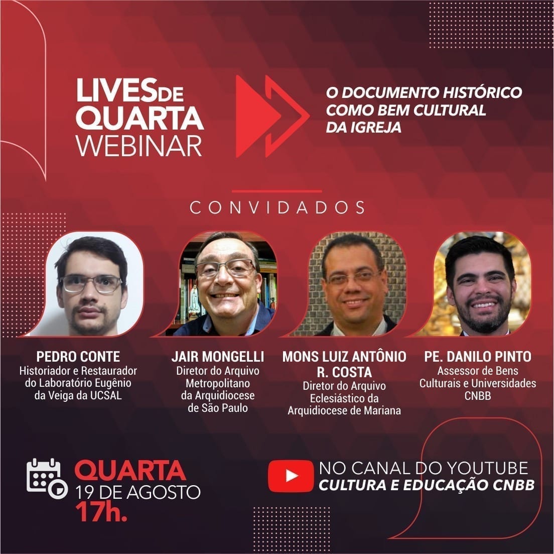 O bate papo terá como convidados, o historiador e restaurador do Laboratório Eugênio da Veiga da UCSAL, Pedro Conte; o diretor do Arquivo Eclesiástico da Arquidiocese de Mariana (MG), Monsenhor Luiz Antônio R. Costa e o diretor do Arquivo Metropolitano da Arquidiocese de São Paulo (SP), Jair Mongelli.