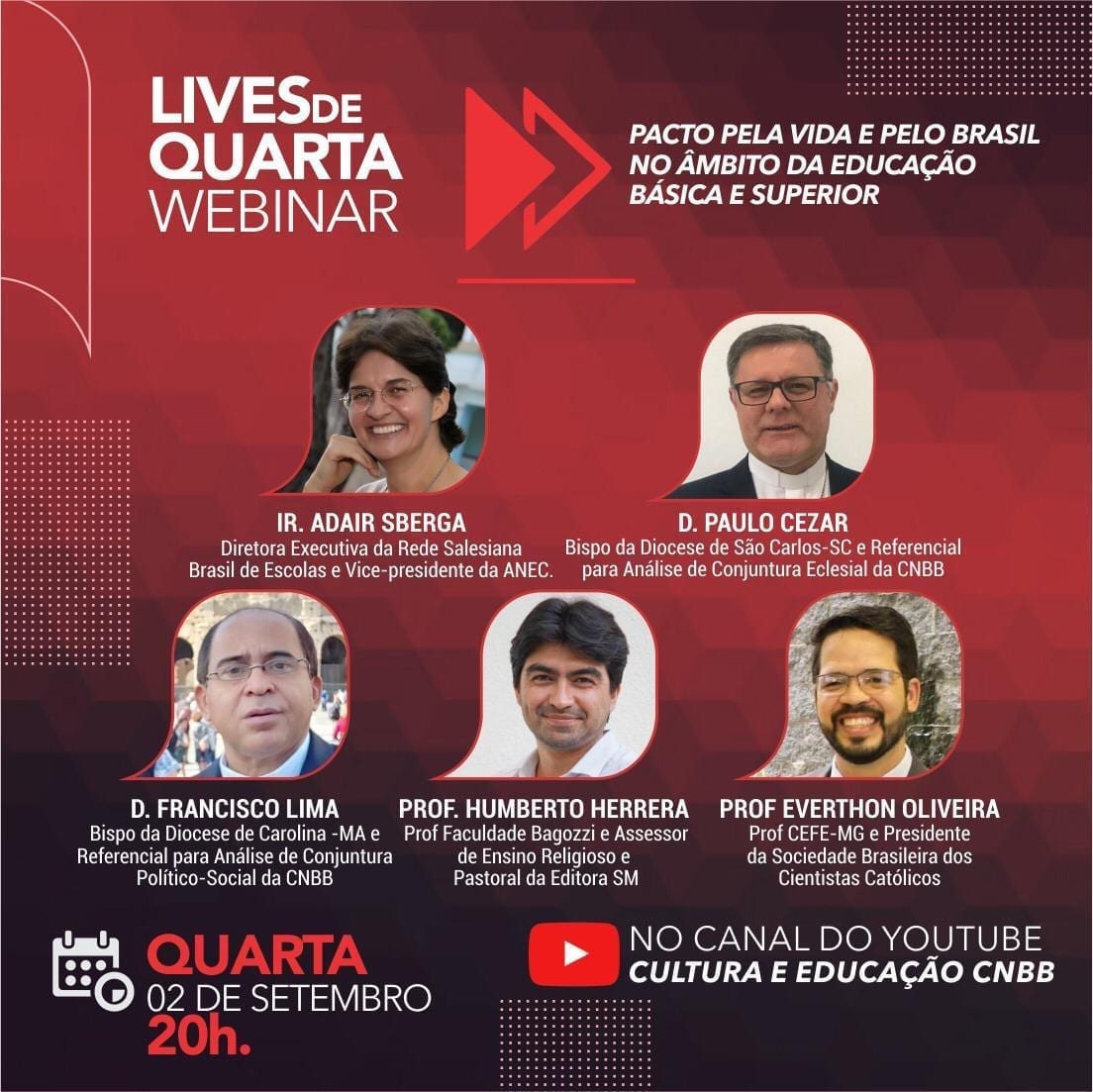 Nesta quarta-feira, 2 de setembro, às 20h, a Comissão Episcopal Pastoral para Cultura e Educação (CEPCE) da Conferência Nacional dos Bispos do Brasil (CNBB) vai realizar o webinar “O pacto pela vida e pelo Brasil no âmbito da educação básica e superior”, no canal da comissão no Youtube.