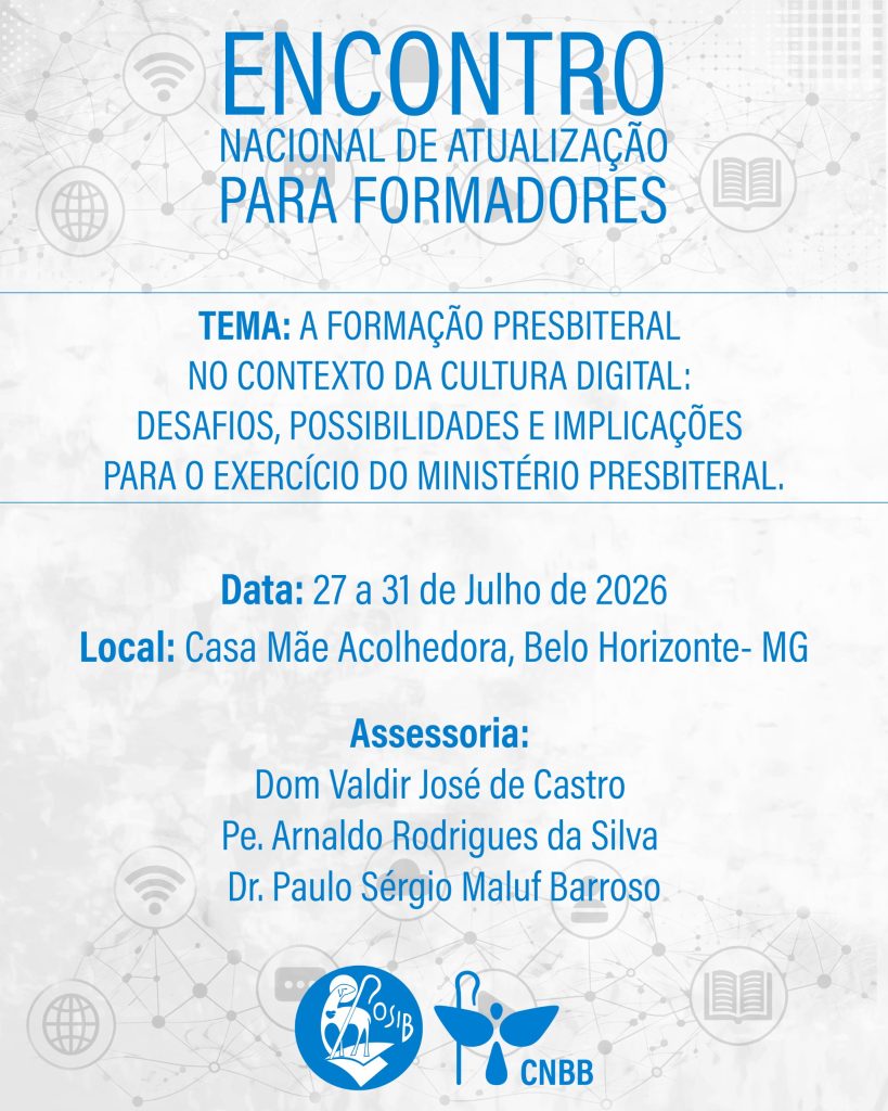 A Organização dos Seminários e Institutos do Brasil (OSIB) realizará, de 27 a 31 de julho, o Encontro Nacional de Atualização para Formadores, reunindo bispos, reitores, formadores e demais responsáveis pela formação presbiteral no país. O evento acontecerá na Casa Mãe Acolhedora, em Belo Horizonte (MG), e terá como tema central: “A formação presbiteral no contexto da cultura digital: desafios, possibilidades e implicações para o exercício do ministério presbiteral”.