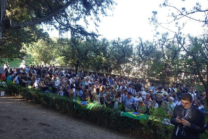 “Estou contente com a presença da imagem de Nossa Senhora aqui nos Jardins. Em 2013, havia prometido retornar, no próximo ano, a Aparecida. Não sei se será possível, mas pelo menos estou mais próximo dela aqui. Convido-lhes a rezar para que ela continue a proteger todo o Brasil, todo o povo brasileiro, neste momento triste. Que ela proteja os pobres, os descartados, os idos